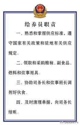 给养员是部队以前的八大员之一,主要职责是采购炊事班所需的米面粮油肉食蔬菜等。同时,还要做好主副食出入库登记,协助司务长做好清理单据,做好台账,协助炊事班做好伙食调剂等。